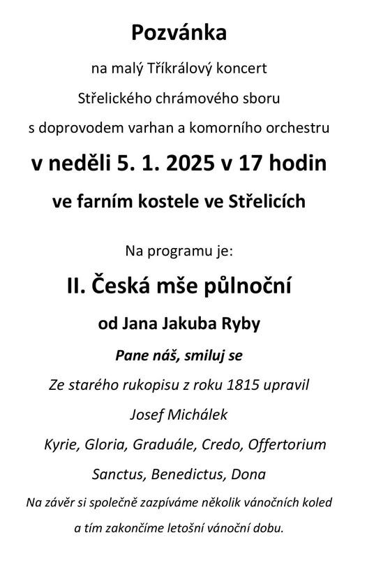 Koncert Střelického chrámového sboru Posted on 2 ledna, 2025 Zveme všechny na nedělní koncert Střelického chrámového sboru.